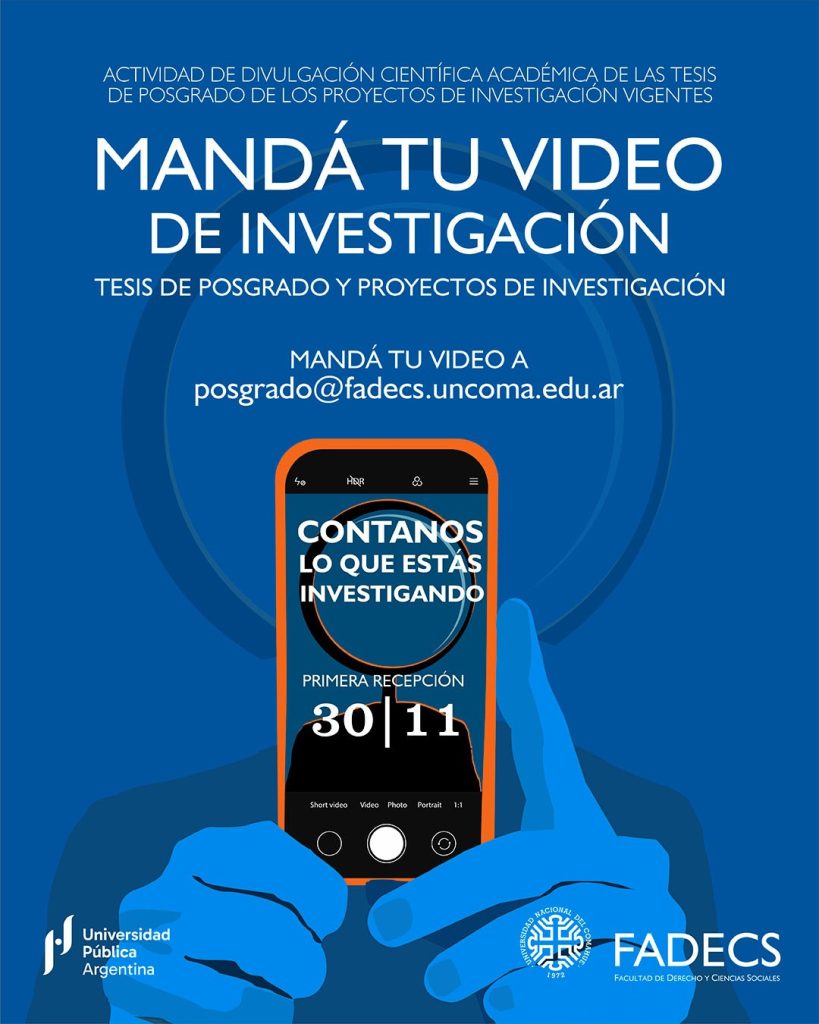 Manda tus vídeos de Trabajo Final Integrador y Tesis de Posgrado y de proyectos de investigación QUEREMOS DIFUNDIR NUESTROS PROYECTOS VIGENTES DE INVESTIGACIÓN CIENTÍFICA La Secretaría de Ciencia y Técnica y Relaciones Internacionales y la Dirección de Posgrado de la FADECS te invitan a que nos cuentes ¿Qué estás investigando? Si te interesa contarnos, hasta […]